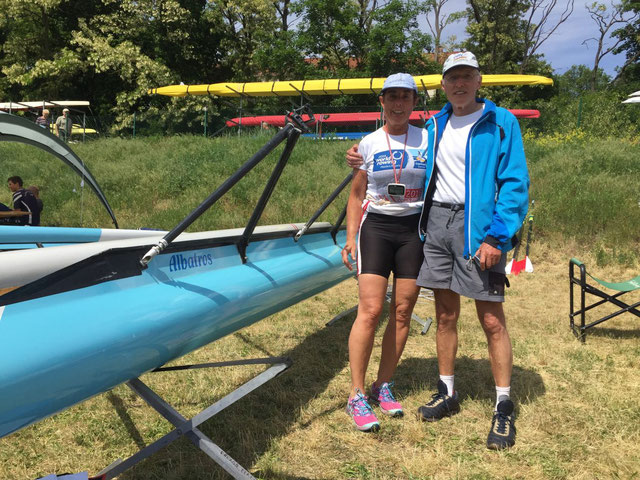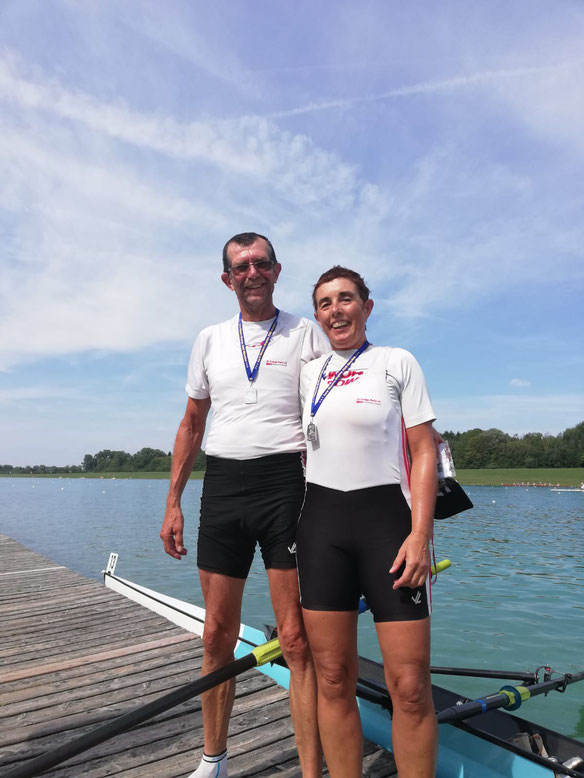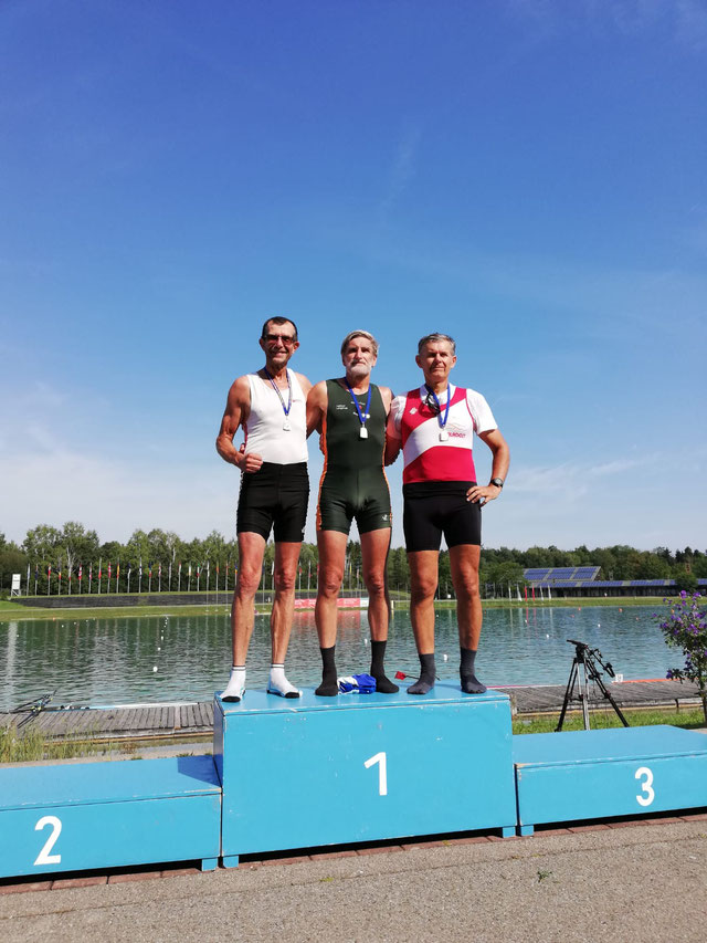Unser Saisonhöhepunkt 2018 ist vorüber. Von Do, 25.07. bis So, 29.07.18 waren „Der Flotte Dreier“ + Dieter Laak auf der Euro-Masters-Regatta in München aktiv. In den Kleinboots-klassen (1x, 2x) erreichten wir – mal wieder – ausnahmslos richtig gute Ergebnisse. Aber herausheben möchte ich trotzdem unser letztes Rennen am Sonntag, den Mixedzweier in der Altersklasse 65 – 69 Jahre. Sabine und Dieter durften sich in einem starken Feld mit den anderen verrückten „Alten“ messen. Beide überstanden das Rennen schadlos und hätte unser „Oldie“ noch gewusst, dass das Ziel erst nach 1000m erreicht ist (und nicht zwei Schläge früher aufgehört) 😉 , wäre evtl. sogar ein dritter Platz möglich gewesen. Aber das Wichtigste für ihn war ohnehin, wieder einmal das „Rennfeeling“ auf dem Wasser bei einer großen Regatta zu spüren. Danke an Sabine, dass sie ihm dabei einen perfekten Schlag vorgab. Mal schauen, ob bzw. wie das weitergeht ...