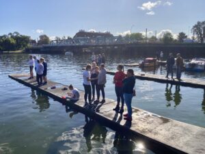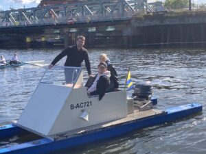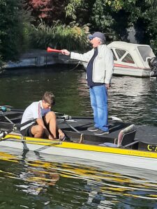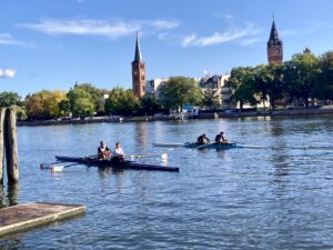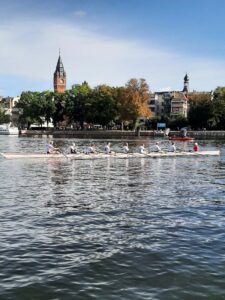 Dann ging es auch los: für etwa 10 Rennen gab es Meldungen, die auch sportlich interessant, sogar spannend wurden. Sicher war das Rudern mit Kastenruderblättern im C-Einer der Jugendlichen ein Highlight, aber den wirklichen Höhepunkt bildete das Abschlussrennen mit unserem Flaggschiff (C-Achter). Steuerfrau Moni hat nach einigen Jahren mal wieder in einem Ruderboot gesessen. Als Gegner hatten sich ein jugendlicher Sechser mit Steuerfuchs Benno und ein Vierer mit den Mastern Valentin, Martin, Vera und Sabine gemeldet.