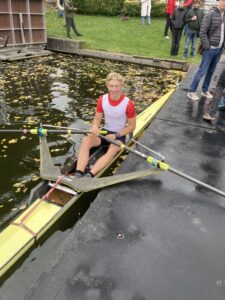 Den Anfang machten die Junioren im Einer. Es gewann unser stärkster, der Anton mit doch deutlichem Vorsprung. Alle Zuschauer dachten zunächst: "na ja, das war doch zu erwarten". Das änderte sich aber schlagartig, als Konsti verkündete, dass Anton mit einem Spanngurt am Boot gerudert ist! Das war dann doch eine Überraschung! Angekommen am Steg meinte Anton auch etwas geschafft: "Jeder Schlag war ja wie der erste Schlag am Start". Das er dennochso deutlich gewann, unterstreicht den Leistungsunterschied...